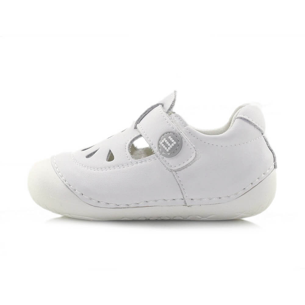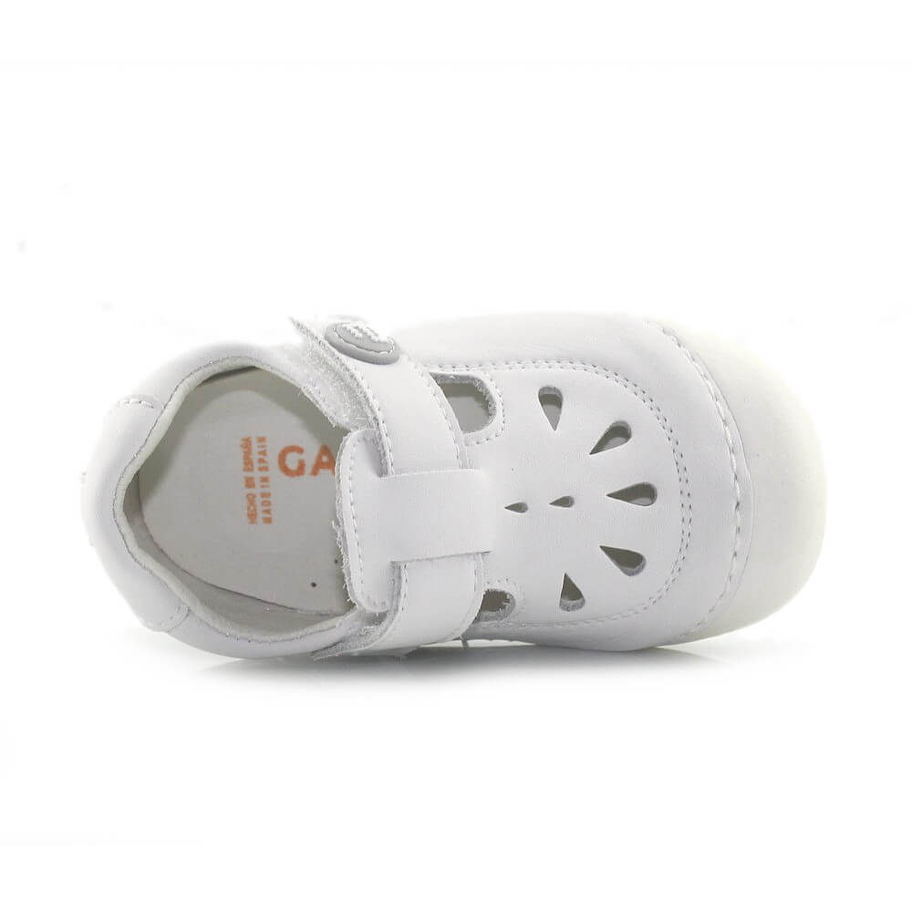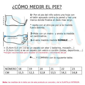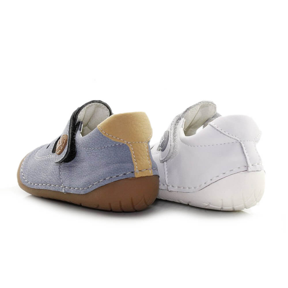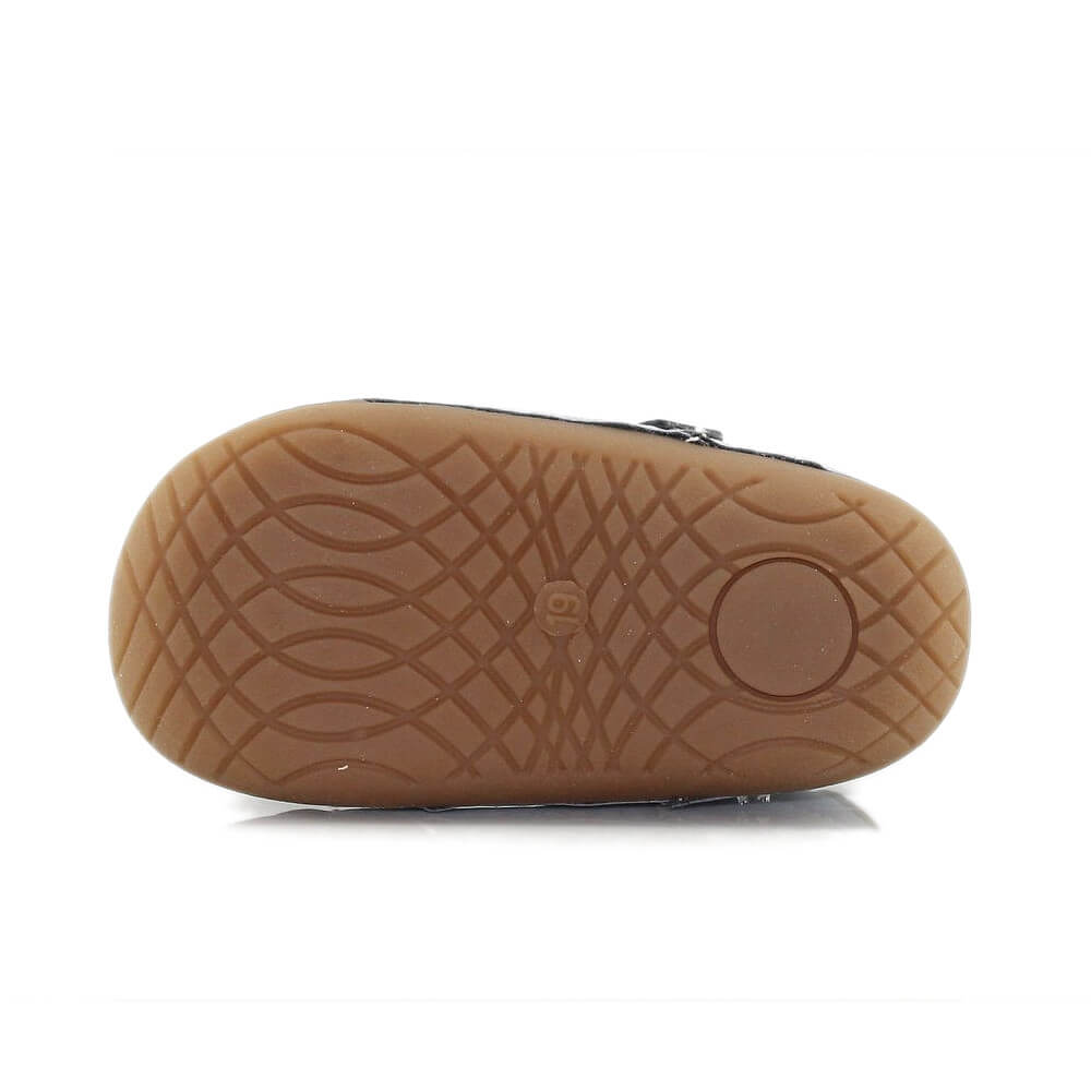 La suela flexible en la zona de los metatarsos favorece el movimiento natural del pie al caminar o gatear. Además, cuenta con refuerzos de goma en la puntera y el talón, que aportan mayor seguridad frente a pequeños golpes y protegen el calzado durante el gateo.
