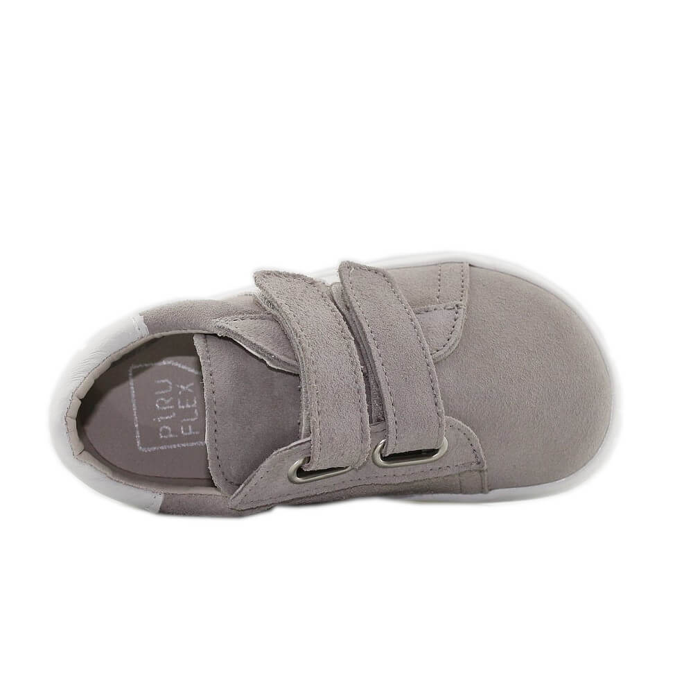 Estas zapatillas, elaboradas en serraje de color gris antracita y con dos bandas laterales en blanco, combinan estilo, comodidad y respeto por el desarrollo natural del pie. Son la elección ideal para el día a día, tanto en el colegio como en los momentos de juego.