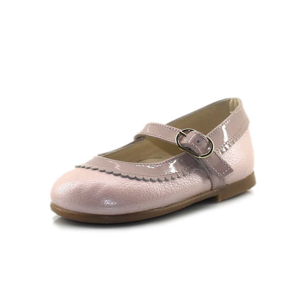 Zapatito niña bebé preandante, fabricado en napa y charol de primera calidad. Forro en piel y piso de vestir en goma antideslizante. Detalle de charol alrededor del cuello del zapato. Hebilla como sistema de cierre. 100% fabricado en España.