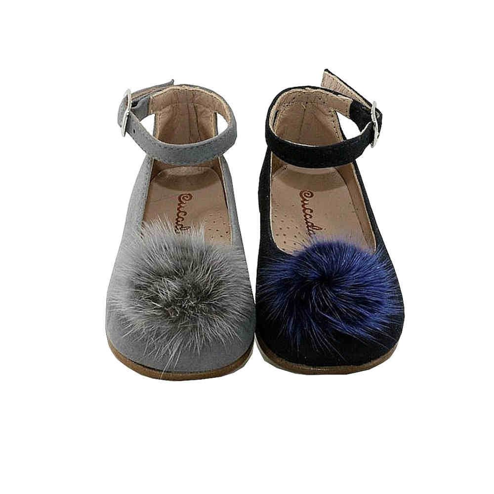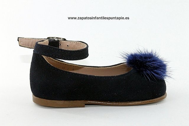 Zapatito estilo francesita de la marca ELI. Fabricado en ante y detalle de pompón en visón. Forro en piel y piso de vestir en goma antideslizante. Correa con hebilla al tobillo. Proporciona seguridad a las más peques. 100% fabricado en ESPAÑA.