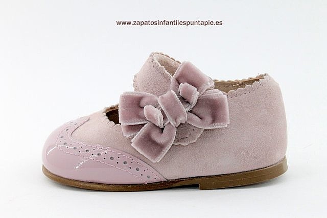 Merceditas marca Eli, de bebé fabricada en charol y ante de primera calidad. Forro en piel y piso de vestir en goma antideslizante. Cierre con velcro adornado con un lazo en terciopelo. Puntera y trasera con refuerzo interior, para sus primeros pasitos. 100% fabricado en España.