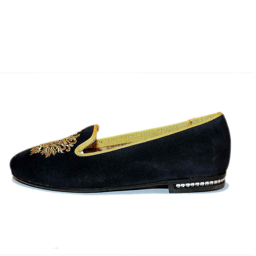 Zapato niña, estilo slepper, marca ELI. Fabricado en ante azul marino de primera calidad y pala bordada con escudo en hilo dorado. Piso de goma antideslizante. Detalle en el tacón de cristales incrustados. Ideal para tus looks más especiales.