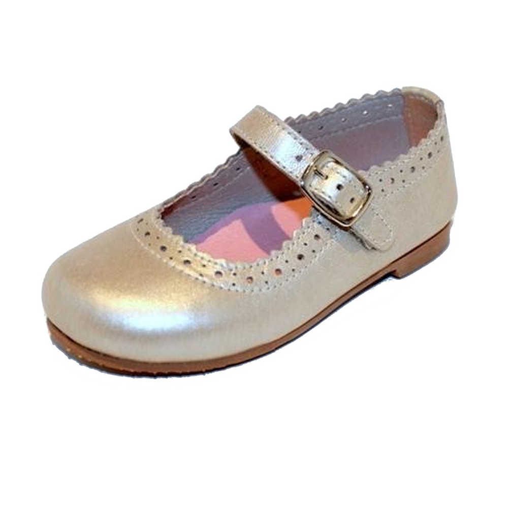 Merceditas hebilla, marca Thousand, realizada en piel metalizada muy suave, de primera calidad. Festón alrededor de todo el zapatito, lo que le da un toque muy especial. Forro en piel y plantilla acolchada para mayor comodidad. Piso de vestir en goma antideslizante y flexible.100% fabricado en ESPAÑA.