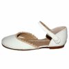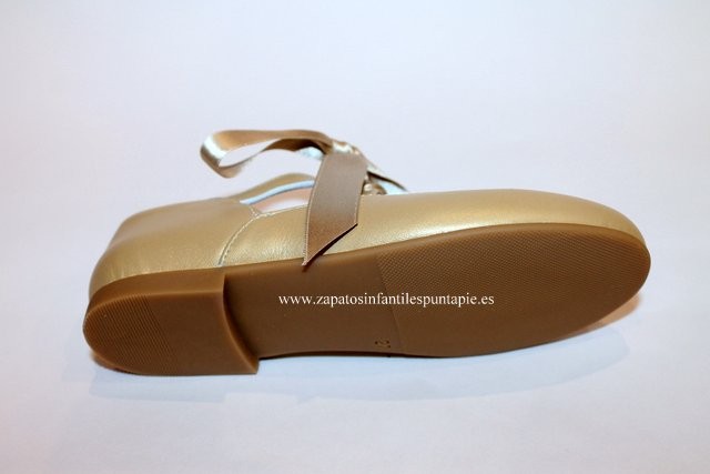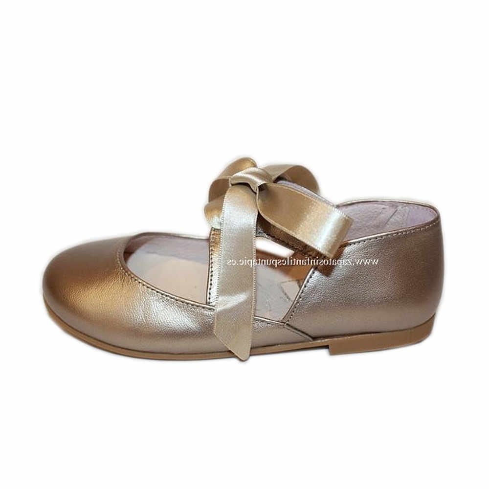 Zapato niña salón Parisittas con aberturas laterales y cierre en el empeine con lazo de raso. Fabricado en piel metalizada de primera calidad, muy suave, ideal para el verano. Piso de vestir en goma antideslizante. 100% fabricado en España.