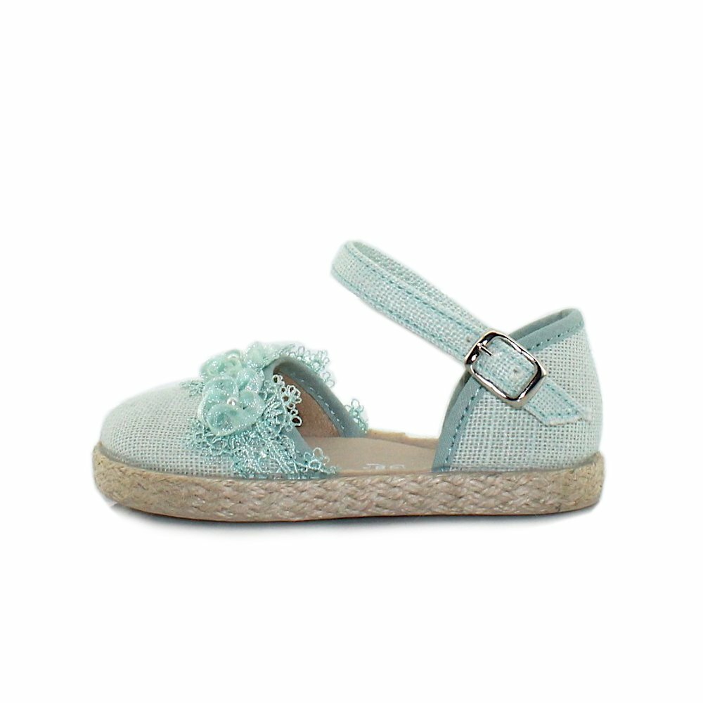 Zapatilla esparto Chuches estilo merceditas. Fabricada en lino y piso en goma decorado en yute. Cierre ajustable con velcro. Detalle de encaje en la pala y pequeñas florecitas. Plantilla en piel. Fabricado en España 100%. Piso perfumado con el característico olor a gominola, para una experiencia única y duradera.